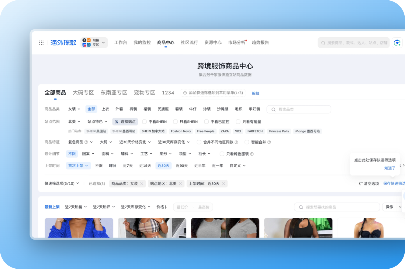 覆盖海外最新最热款式,监控竞对站点及社媒营销策略,挖掘海外市场服饰趋势,覆盖竞店投放数据