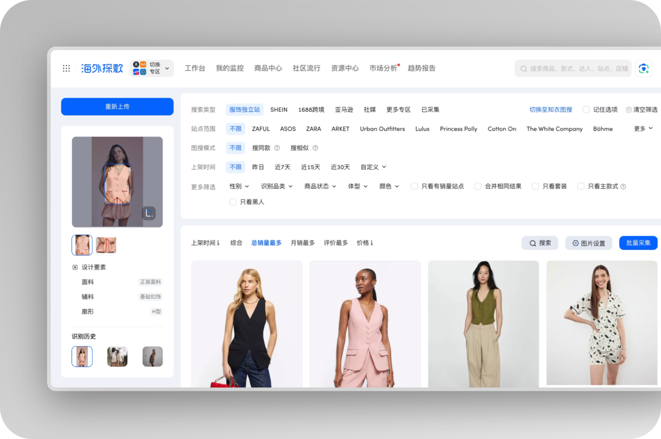 基于大数据挖掘和以图搜图技术,获取海外服饰市场和竞争品牌的新款/爆款以及社媒Ins款式。