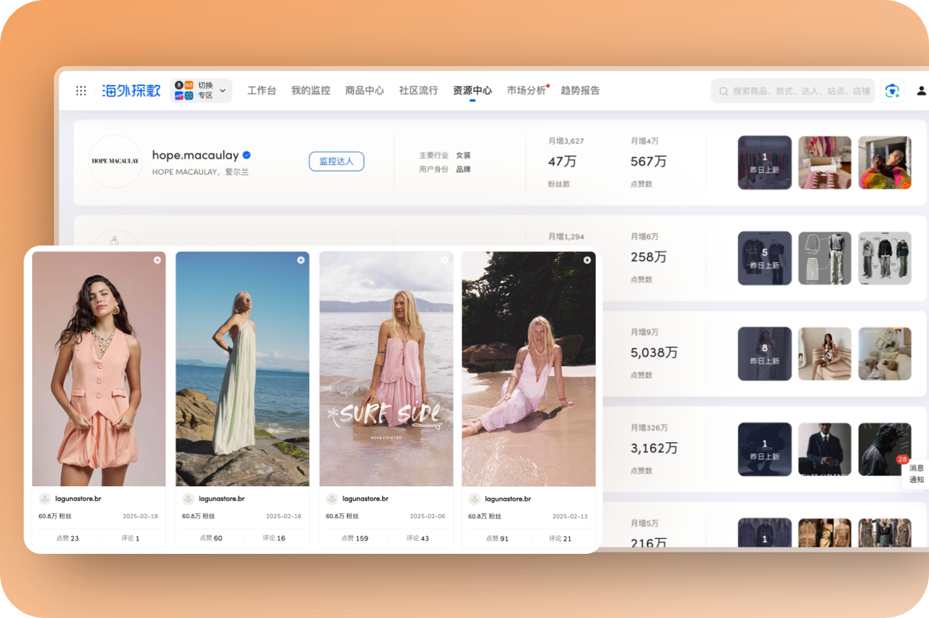 收录各地区5000+海外服饰电商站,基于特⾊筛选(品牌、价格、销量、设计要素等)快速找到服饰独⽴站在任意时间段⾥上架的最新款和热卖款。