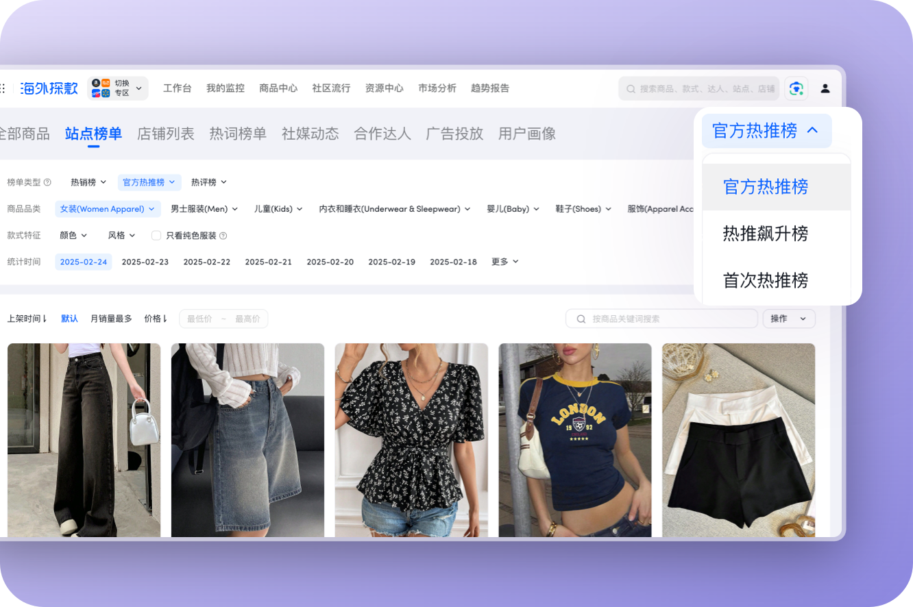 ⽀持随时查看及导出各站点在任意时间范围内的热推商品,基于独家销量算法模型,打造海外站点的热销榜单,找到感兴趣站点中不同⾏业、品类和⻛格下的热销商品。